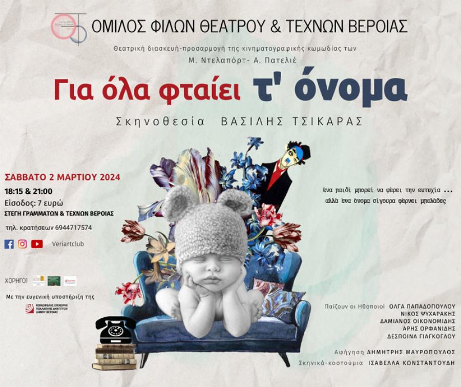 Ο Όμιλος Φίλων Θεάτρου & Τεχνών Βέροιας θα παρουσιάσει την κωμωδία “Για όλα φταίει τ΄ όνομα” σε σκηνοθεσία Βασίλη Τσικάρα το Σάββατο 2 Μαρτίου 2024 στις 18:15 (απογευματινή παράσταση) και 21:00 (βραδυνή παράσταση) στο θέατρο της Αντωνιάδειου Στέγης Γραμμάτων και Τεχνών Βέροιας.