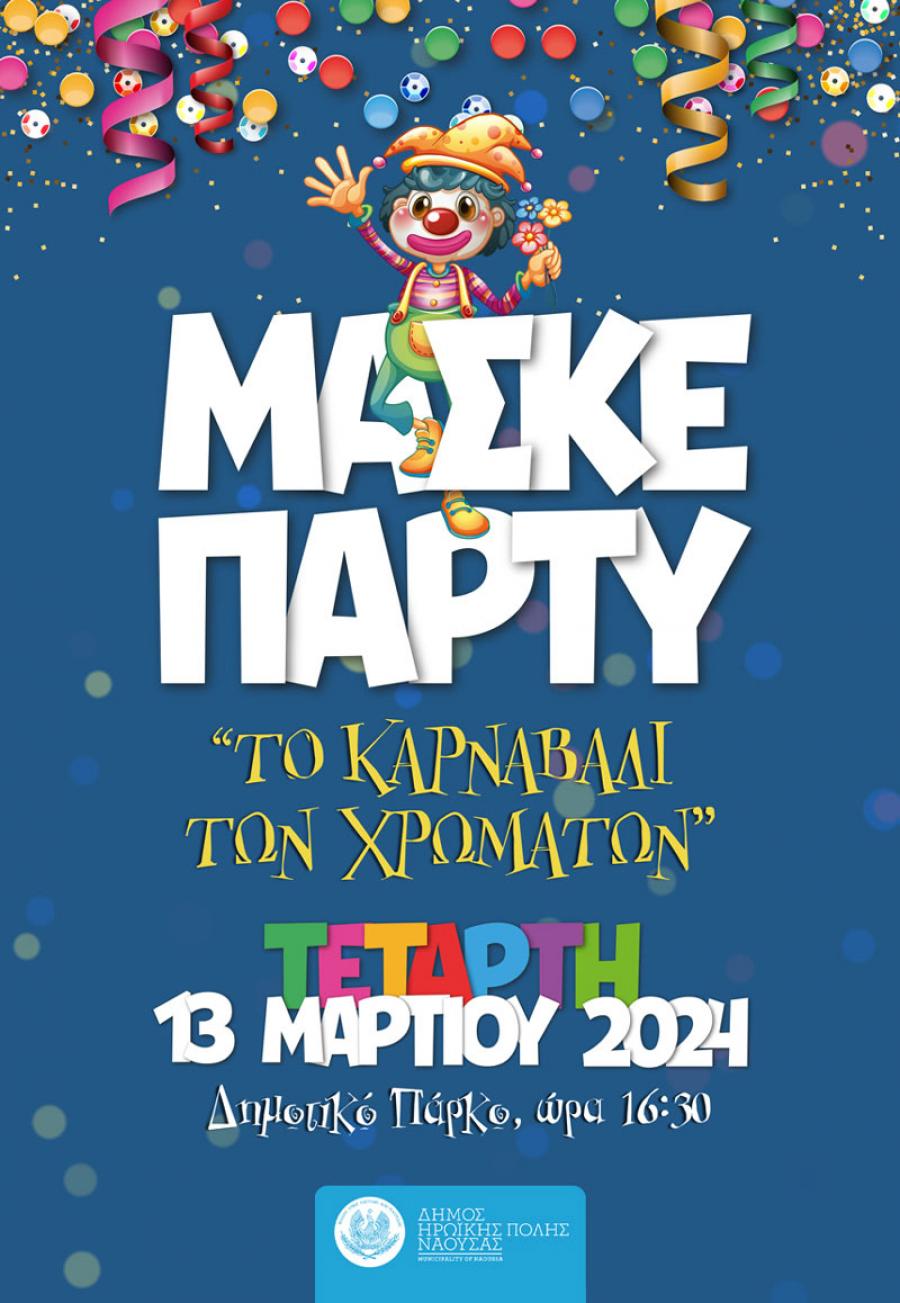 Ο Δήμος Η.Π. Νάουσας στο πλαίσιο των εκδηλώσεων "Νάουσα-Αποκριά 2024" διοργανώνει την Τετάρτη 13 Μαρτίου και ώρα 16:30 στο Πλακόστρωτο του Δημοτικού Πάρκου το μασκέ πάρτι "Το καρναβάλι των χρωμάτων" με ελεύθερη είσοδο σε όλα τα παιδιά.