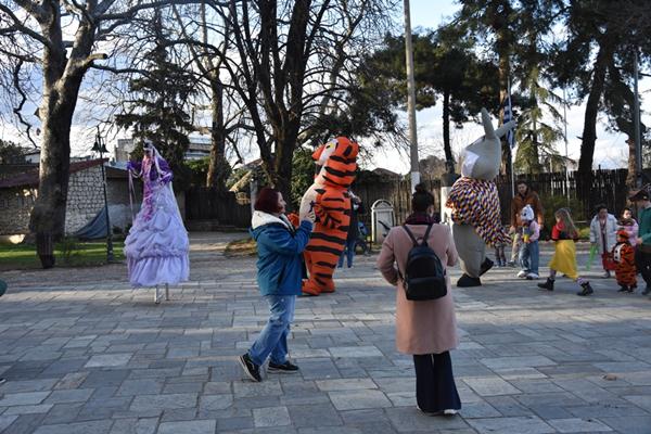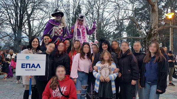 Η ομάδα θεάτρου δρόμου «Teatro Theama», με φαντασία, ρυθμό και χρώματα, μάγεψε μικρούς και μεγάλους και χάρισε αξέχαστες εικόνες σε όλα τα παιδιά. Ξυλοπόδαροι – Ζογκλέρ – Ακροβάτες, εντυπωσιακές φουσκωτές φιγούρες καρτούν ύψους 3,5 μ., κινούνταν, χόρευαν και συμμετείχαν ενεργά στο δρώμενο, έστησαν το δικό τους αποκριάτικο «γαϊτανάκι», σε συνδυασμό μ’ ένα μοναδικό Bubble Show, ενώ σπουδαστές του τμήματος αισθητικής του ΕΠΑΛ Νάουσας έκαναν δωρεάν face painting σε όλα τα παιδιά.