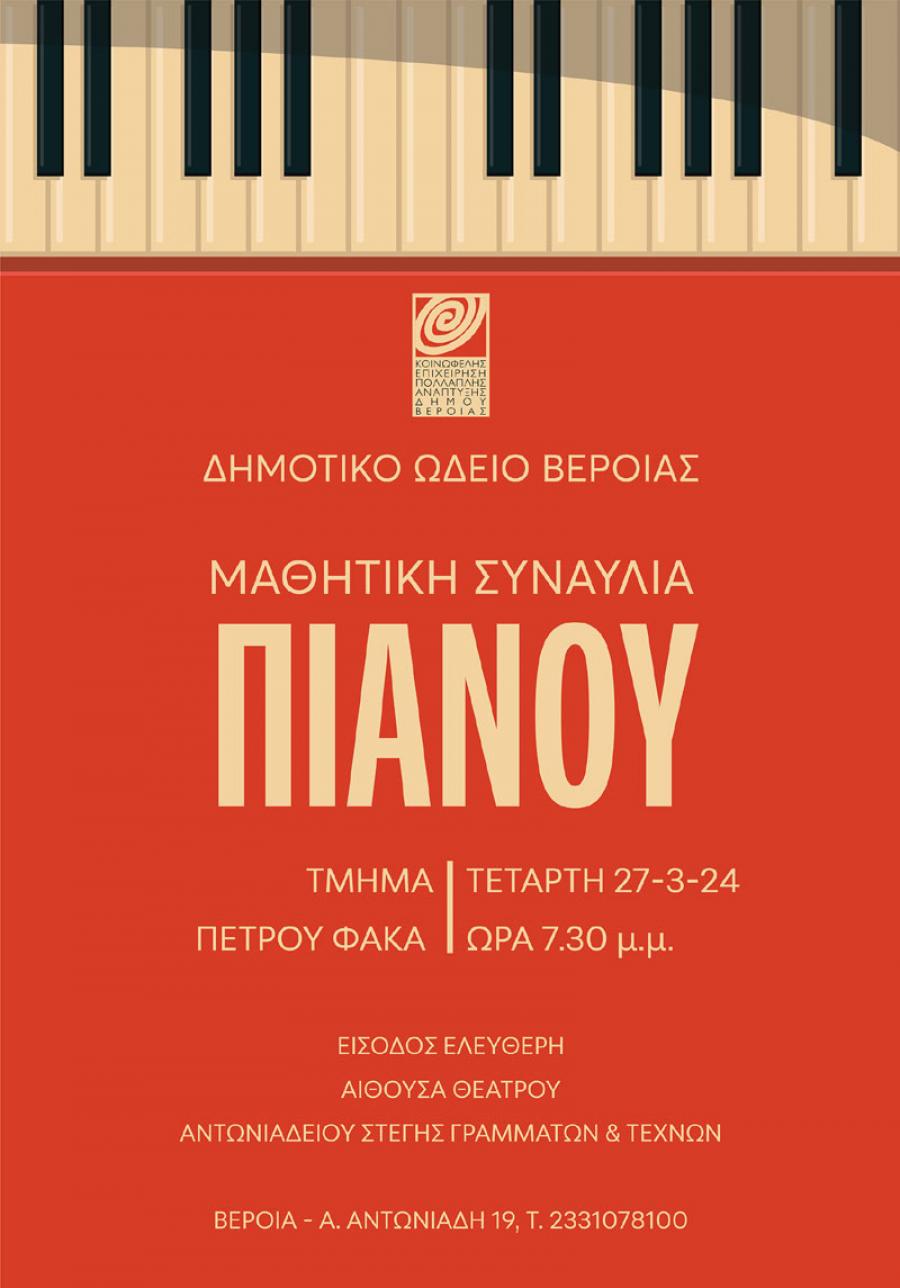 Οι μαθητικές εκδηλώσεις της ΚΕΠΑ Δήμου Βέροιας, ξεκινούν την Τετάρτη 27 Μαρτίου, ώρα 7:30 στην Αντωνιάδειο Στέγη Γραμμάτων & Τεχνών με τους σπουδαστές πιάνου, του τμήματος του Πέτρου Φάκα.