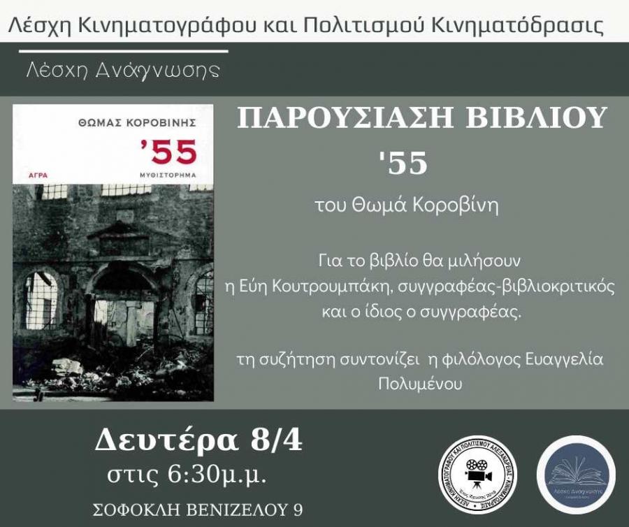 H Λέσχη Ανάγνωσης της Λέσχης Κινηματογράφου και Πολιτισμού Αλεξάνδρειας σάς προσκαλεί τη Δευτέρα 8 Απριλίου 2024 στις 6.30 μμ στη Λέσχη μας (Σοφ.Βενιζέλου 9) σε μια εκδήλωση –γνωριμία με τον καταξιωμένο συγγραφέα Θωμά Κοροβίνη και το βιβλίο του “55”.