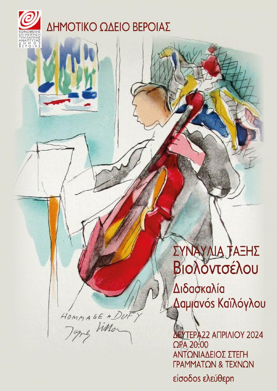 Σήμερα 22 Απριλίου και ώρα 8 μ.μ οι μαθητές της τάξης του βιολοντσέλου του Δημοτικού Ωδείου Βέροιας θα παρουσιάσουν στο πλαίσιο της εκπαιδευτικής χρονιάς 2023-2024 συναυλία με έργα των B. Marcello, A. Vivaldi, J.B.Breval, J.S.Bach και άλλων συνθετών.