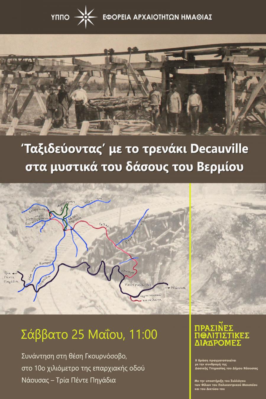 Πώς συνδέεται ένα δάσος γεμάτο ψιθύρους, μυστικά του μύθου και φυσικές ομορφιές με ένα εργοστάσιο ξυλείας, ένα πετρόκτιστο γιοφύρι, ένα εναέριο τρενάκι, ένα ορεινό εκκλησάκι και τα δροσερά νερά ποταμού; Με αφετηρία το παλαιό εργαστάσιο ξυλείας στη θέση «Γκουρνόσοβο», που απέχει 10 χλμ. από την πόλη της Νάουσας και βρίσκεται σε υψόμετρο 1.050 μ, θα περπατήσουμε απόσταση περίπου 3 χλμ. στο μονοπάτι, που πριν από 100 χρόνια ήταν στρωμένο με σιδηροτροχιές, επάνω στις οποίες "αγκομαχούσε"ένα τρενάκι (ντεκοβιλ) που μετέφερε μασίφ κορμούς δένδρων από θέσεις του Βερμίου στο νεροκίνητο - ατμοκίνητο πριστήριο, που μετέτρεπε τους κορμούς σε πριστή ξυλεία. Θα πορευτούμε μέσα από μία γαλαρία, θα περάσουμε επάνω από πετρόκτιστα γεφύρια που δάμαζαν τα ποτάμια του Βερμίου και θα αντικρίσουμε τους λιθόκτιστους αναλληματικούς τοίχους που προστάτευαν τη σιδηροδρομική γραμμή. Φτάνοντας στην περιοχή "βάθρες"και αντικρίζοντας τον καταρράκτη του μεγαλύτερου ποταμού του Βερμίου, που πηγάζει από τις πηγές “καραμπουρνάρι”, θα συναντήσουμε τον χώρο επιμελητείας των ανταρτών του 16ου συντάγματος του ΕΛΑΣ και στην άλλη πλευρά του ποταμού, το μονόχωρο εκκλησάκι της Μεταμόρφωσης του Σωτήρος.