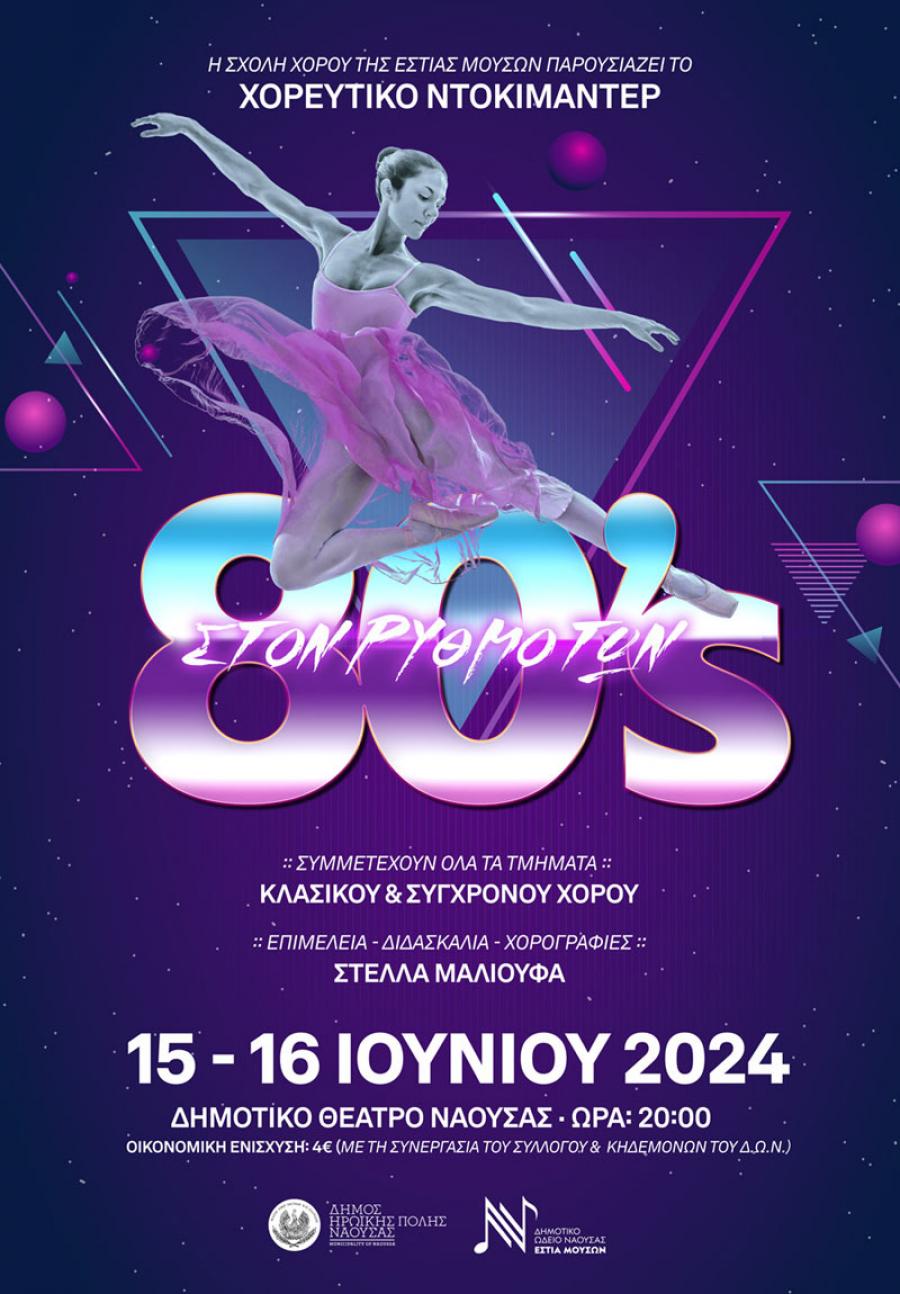 Η Σχολή Κλασικού και Σύγχρονου Χορού του Δημοτικού Ωδείου Νάουσας "Εστίας Μουσών"σε συνεργασία του Συλλόγου Γονέων & Κηδεμόνων του Δ.Ω.Ν., θα πραγματοποιήσουν την ετήσια παράστασή τους με τίτλο "Στο ρυθμό των 80΄s", το Σάββατο 15 και την Κυριακή 16 Ιουνίου 2024 και ώρα 20:00, στο Δημοτικό θέατρο Νάουσας "Μ. Θεοδωράκης".
