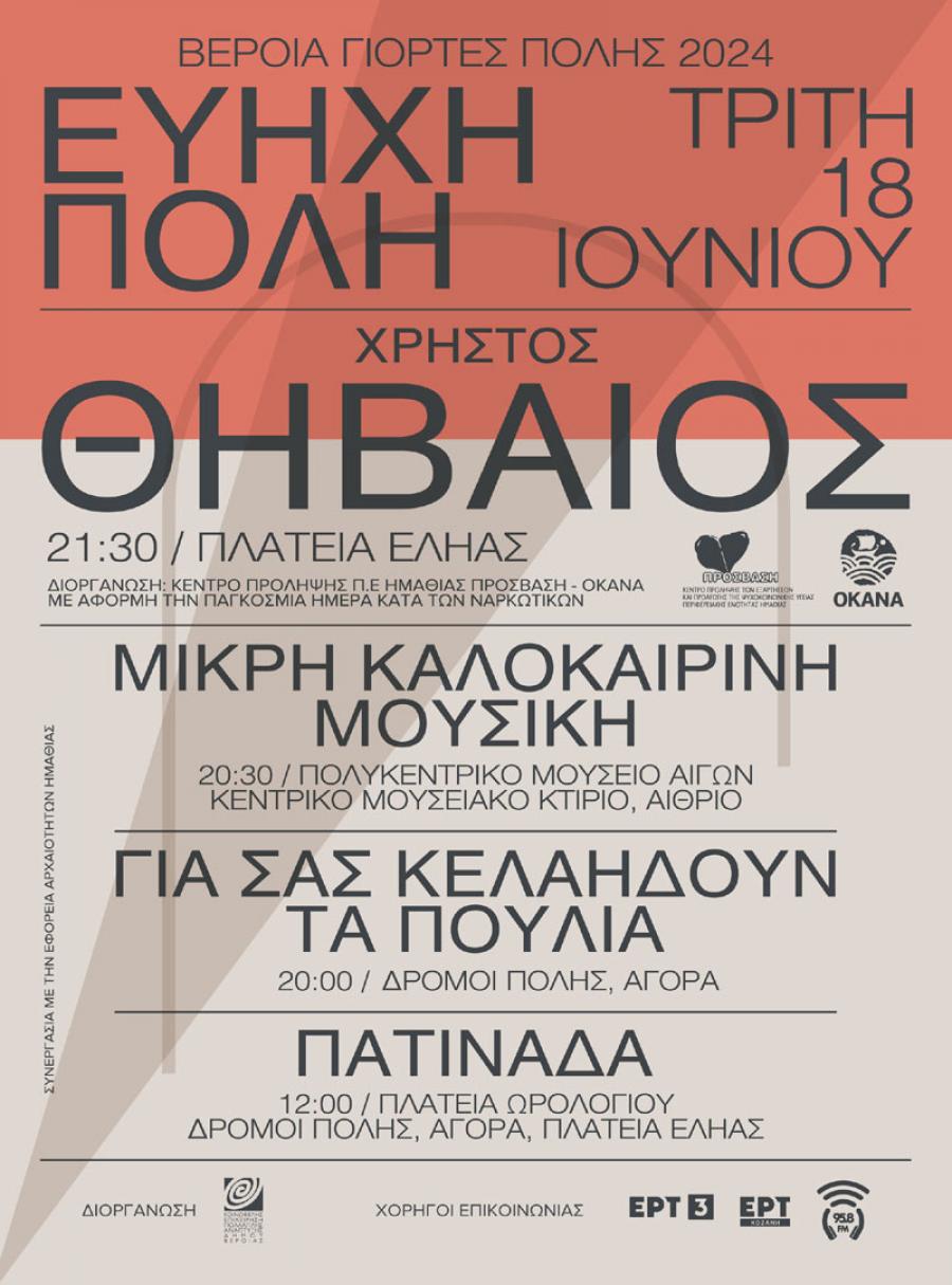 Η ΚΕΠΑ Δήμου Βέροιας, από τις 18 έως και 21 Ιουνίου, διοργανώνει και φέτος την 16η «Εύηχη Πόλη 2024», με 12 συναυλίες, 210 καλλιτέχνεςκαι εκθέσεις φωτογραφίας, σε πλατείες και γειτονιές της σύγχρονης και παλιάς πόλης, καθώς και εργαστήρια-εκπαιδευτικά σεμινάρια περί Τέχνης, από την Λυρική Σκηνή και το ΔΗΠΕΘΕ.