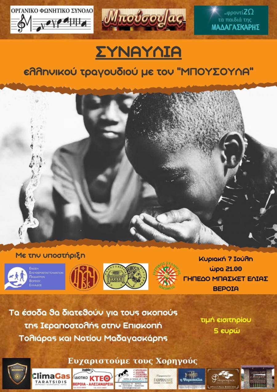 Το Φωνητικό Οργανικό Σύνολο ΜΟΝΟΓΡΑΜΜΑ διοργανώνει, σε συνεργασία με την Ένωση Ελευθεροεπαγγελματιών Παιδιάτρων Βορείου Ελλάδος, συναυλία ελληνικού τραγουδιού με το μουσικό σχήμα ΜΠΟΥΣΟΥΛΑΣ.