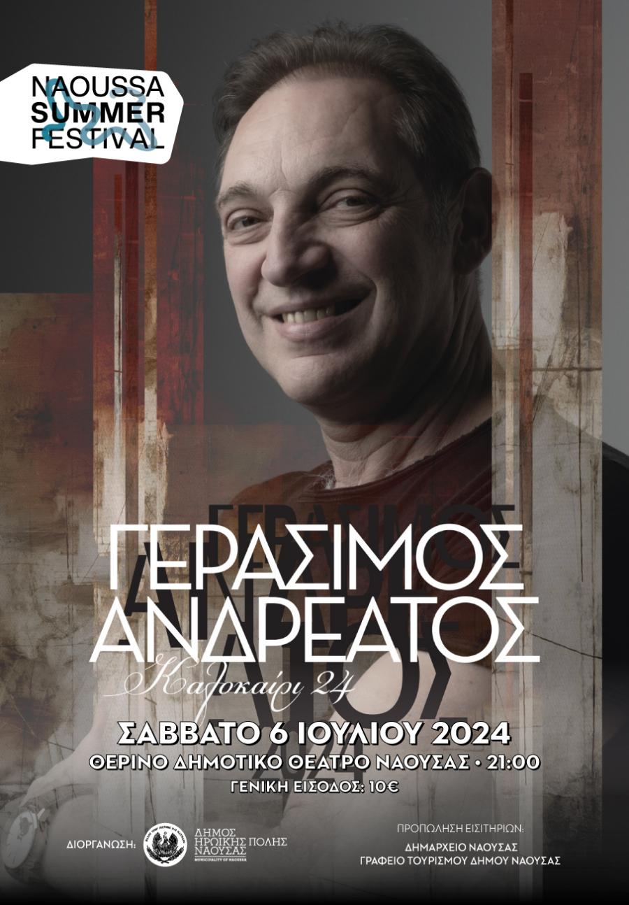 Ο Γεράσιμος Ανδρεάτος έρχεται στη Νάουσα και θα μας χαρίσει μοναδικές μελωδικές στιγμές το βράδυ του Σαββάτου 6 Ιουλίου στις 21.00 στο ανακαινισμένο Θερινό Δημοτικό Θέατρο Νάουσας.