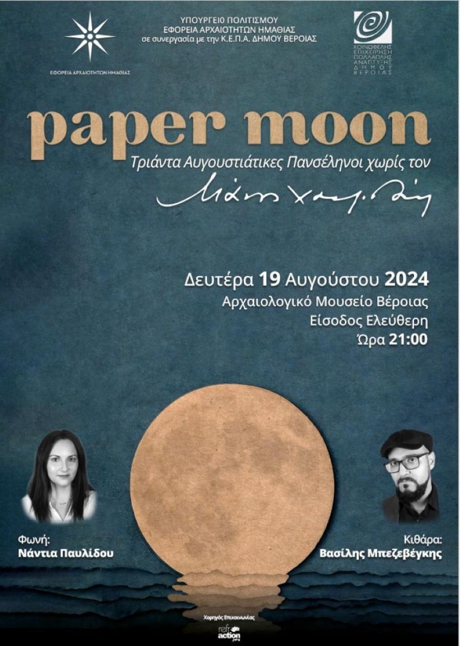 Η Εφορεία Αρχαιοτήτων Ημαθίας σε συνεργασία με την Κ.Ε.Π.Α. του Δήμου Βέροιας γιορτάζουν την πανσέληνο με τη συναυλία «PaperMoon», ένα αφιέρωμα στα 30 χρόνια χωρίς τον Μάνο Χατζιδάκι.