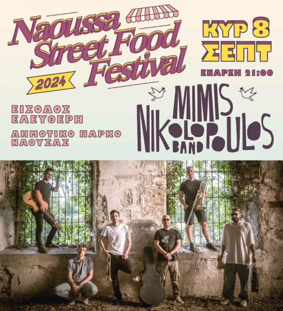 Συναυλία θα πραγματοποιήσουν οι «Μίμης Νικολόπουλος Band», την Κυριακή 8 Σεπτεμβρίου στις 21.00, στο Δημοτικό Πάρκο Νάουσας, στα πλαίσια του NaoussaStreetFoodFestival2024 WineEdition.