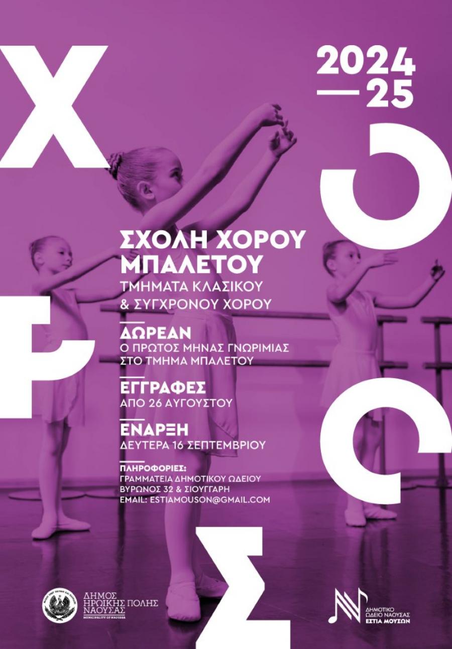Από τη Δευτέρα 16 Σεπτεμβρίου 2024 ξεκινούν τα τμήματα μπαλέτου για τη νέα σχολική χρονιά, στο Δημοτικό Ωδείο Νάουσας "Εστία Μουσών".