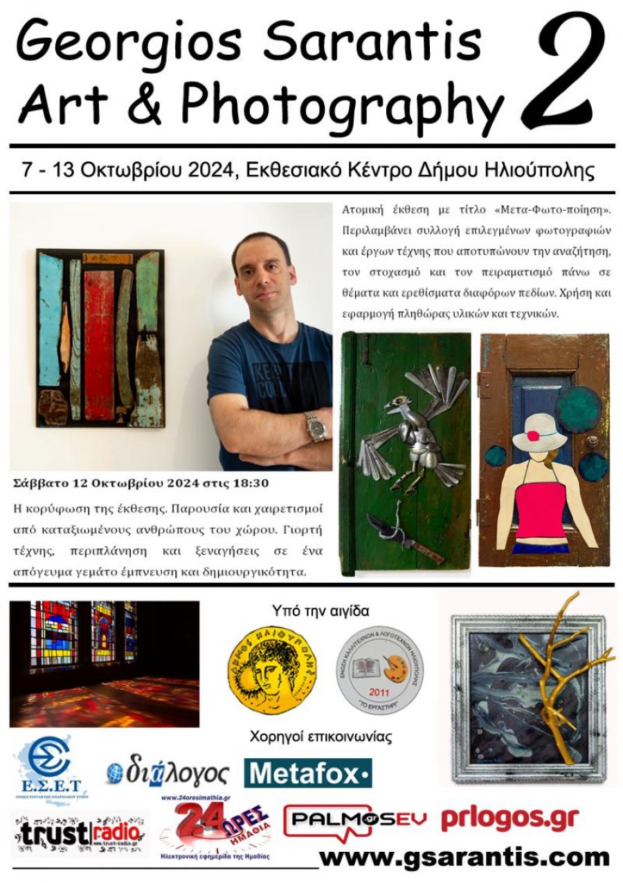 Ο Γιώργος Σαράντης παρουσιάζει τη νέα του ατομική καλλιτεχνική έκθεση με τίτλο «Μετα-Φωτο-ποίηση» στο Εκθεσιακό Κέντρο Δήμου Ηλιούπολης, από τις 7 έως τις 13 Οκτωβρίου 2024. Σε αυτήν περιλαμβάνεται μια συλλογή επιλεγμένων φωτογραφιών και έργων τέχνης που αποτυπώνουν την αναζήτηση, τον στοχασμό και τον πειραματισμό πάνω σε θέματα και ερεθίσματα διαφόρων πεδίων, με χρήση και εφαρμογή πληθώρας υλικών και τεχνικών.
