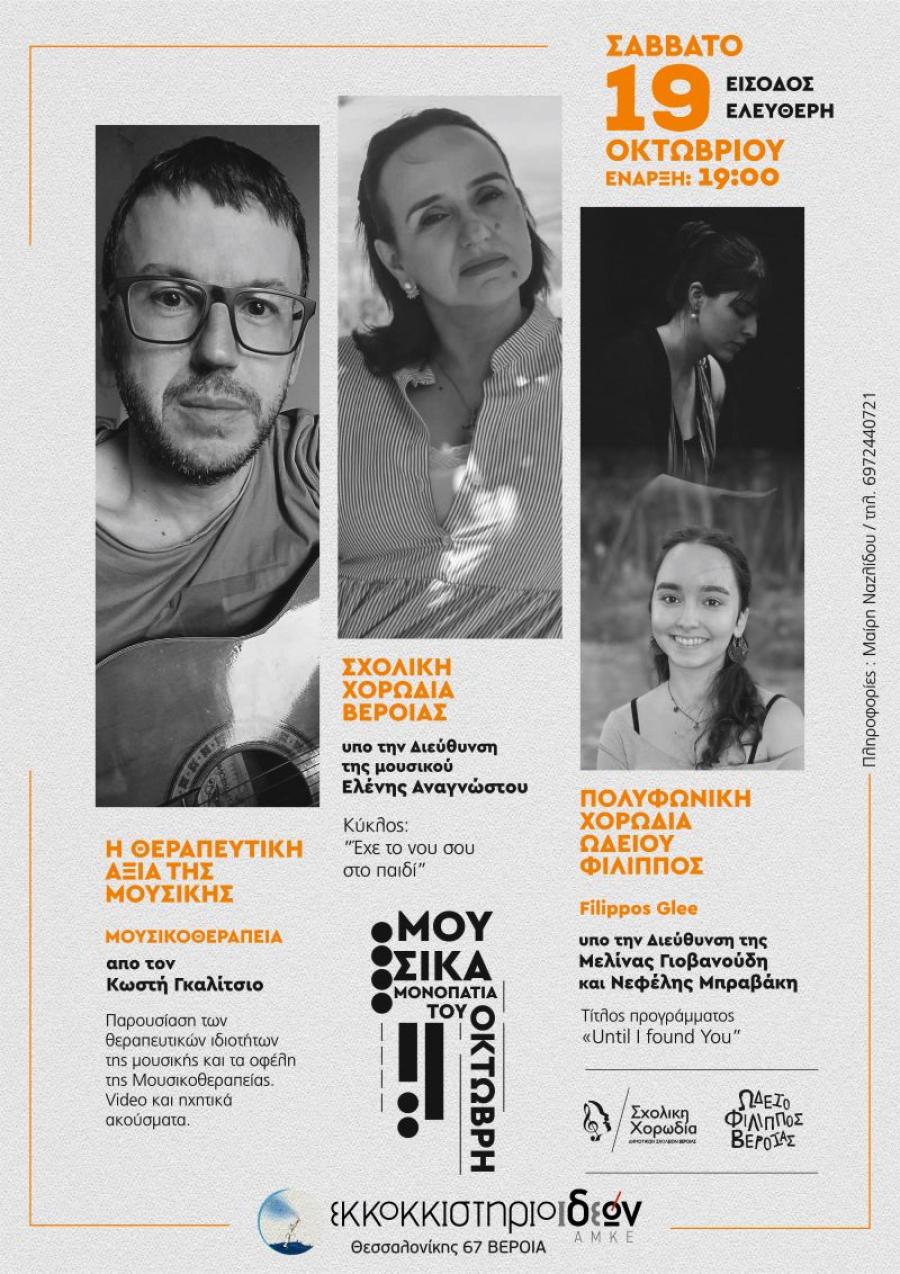Ο μουσικοθεραπευτής και δάσκαλος Κωστής Γκαλίτσιος θα μιλήσει για την ΘΕΡΑΠΕΥΤΙΚΗ ΑΞΙΑ ΤΗΣ ΜΟΥΣΙΚΗΣ, και η «μαέστρος των ψυχών» Ελένη Αναγνώστου μούσα για την παιδική χορωδία της θα μας χαρίσει τραγούδια με τις αγγελικές φωνές των μικρών μαθητών της, για να πάρει τη σκυτάλη η ταλαντούχα πολυφωνική ομάδα του ΩΔΕΙΟΥ ΦΙΛΟΠΠΟΣ, η FilipposGleeκαι να μας ταξιδέψει…