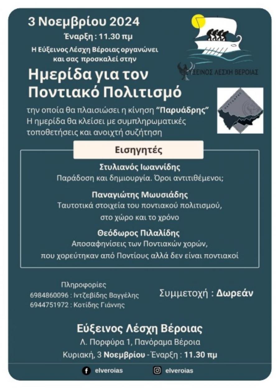 Η Εύξεινος Λέσχη Βέροιας διοργανώνει μια ξεχωριστή ημερίδα, αφιερωμένη στον πολιτισμό της περιοχής του Πόντου. Η διοργάνωση αυτή με τίτλο "Ημερίδα για τον Ποντιακό Ελληνισμό" θα πραγματοποιηθεί την Κυριακή 3 Νοεμβρίου, με έναρξη στις 11.30 π.μ. στο Πολιτιστικό-Πνευματικό κέντρο της Λέσχης, στο Πανόραμα της Βέροιας.
