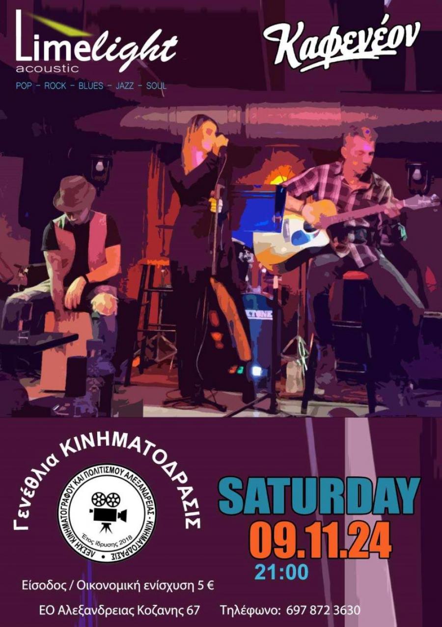 Μαζί μας η ακουστική rockμπάντα Limelightμε την δικιά μας Όλγα Κουτσώνου (φωνητικά) και τους Νίκο Παυλάκης (κιθάρα) και Θοδωρή Κουτσό (cajon) για να μας ταξιδέψουν μουσικά με blues ,rock και pop μελωδίες.