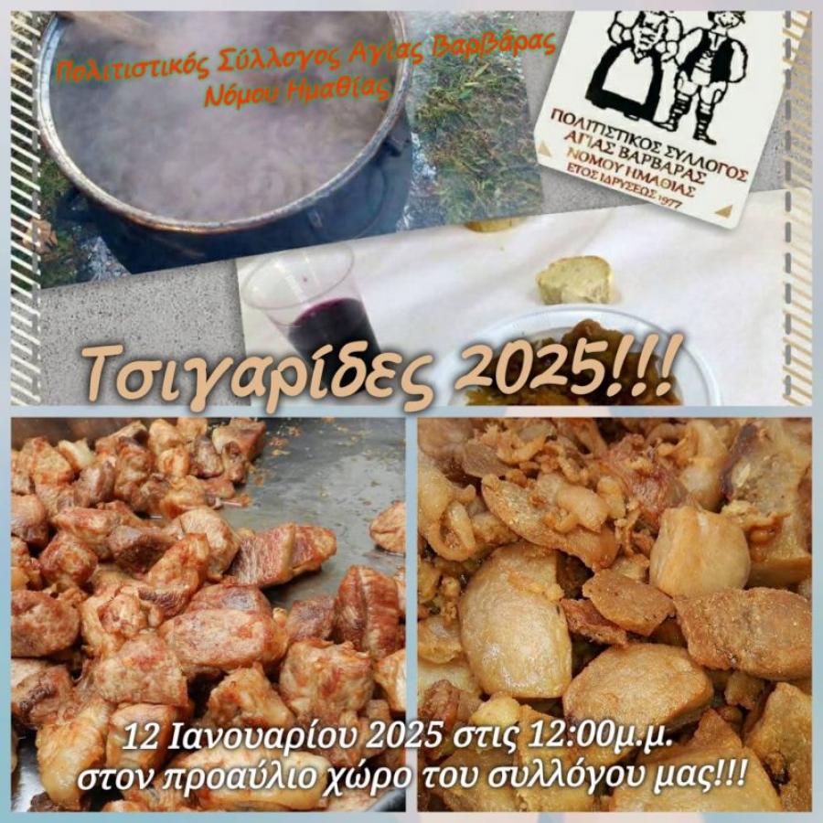 Έθιμο της Γουρουνοχαράς και Τσιγαρίδας διοργανώνει ο Πολιτιστικός Σύλλογος Αγίας Βαρβάρας, διοργανώνει την Κυριακή 12 Ιανουαρίου στις 12 το μεσημέρι στο προαύλιο χώρο των γραφείων του Συλλόγου.