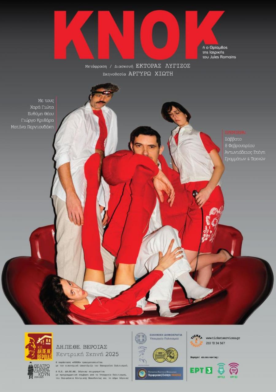 Το ΔΗ.ΠΕ.ΘΕ. Βέροιας ανοίγει την Κεντρική του Σκηνή για το 2025 με το έργο ΚΝΟΚ, μια διασκευή του έργου «ΚΝΟΚ ή ο θρίαμβος της Ιατρικής» του Jules Romains, σε σκηνοθεσία Αργυρώς Χιώτη.