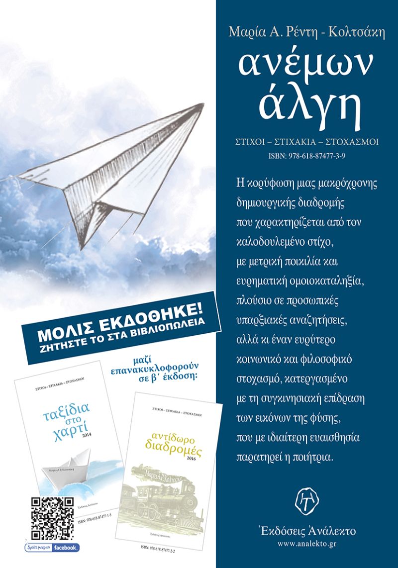 Μόλις κυκλοφόρησε από τον εκδοτικό οίκο «Ἀνάλεκτο», το νέο βιβλίο της Ναουσαίας ποιήτριας Μαρίας Α. Ρέντη - Κολτσάκη, Ανέμων Άλγη.