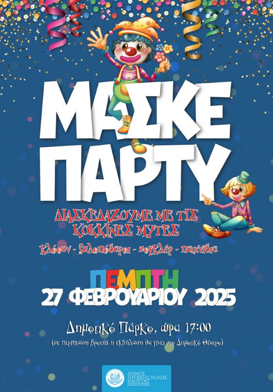 Ο Δήμος Ηρωικής Πόλης Νάουσας στο πλαίσιο των εκδηλώσεων "Νάουσα - Αποκριά 2025" διοργανώνει την Πέμπτη 27 Φεβρουαρίου και ώρα 17:00 στο πλακόστρωτο του Δημοτικού Πάρκου Νάουσας παιδική γιορτή με την καλλιτεχνική ομάδα "Κόκκινες Μύτες".