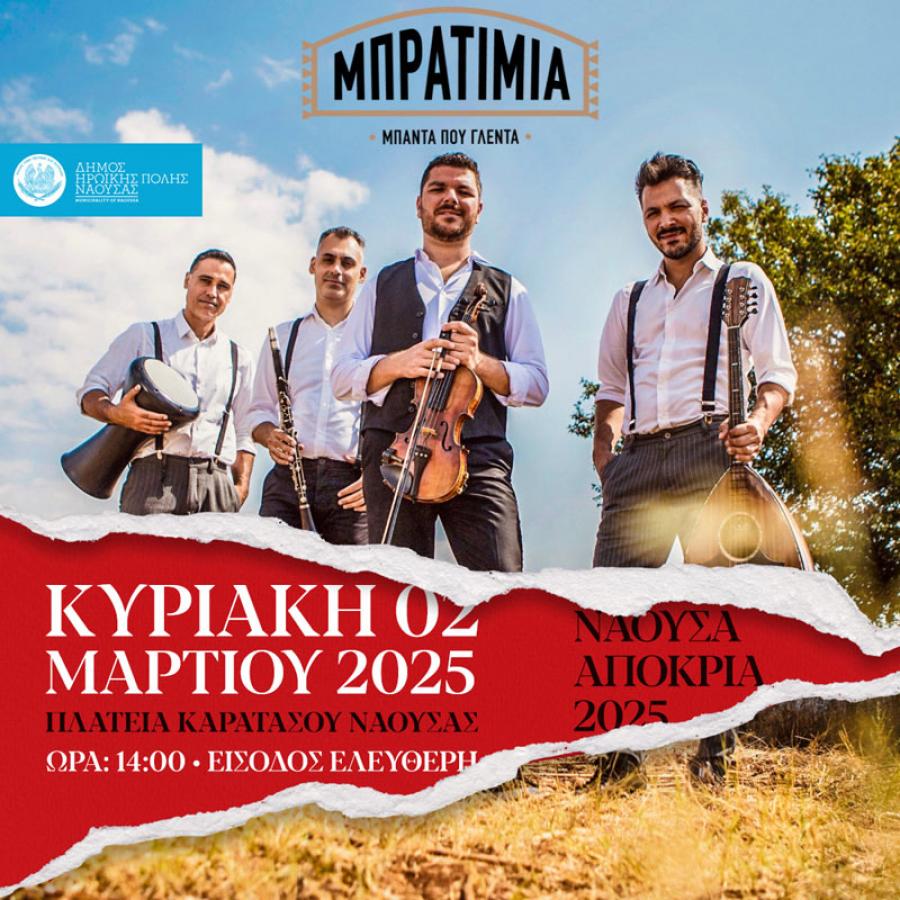 Ο Δήμος Η.Π. Νάουσας στο πλαίσιο των εκδηλώσεων "Νάουσα - Αποκριά 2025" διοργανώνει την Κυριακή 2 Mαρτίου 2025 και ώρα 14:00 στην Πλατεία Καρατάσου συναυλία - παραδοσιακό γλέντι με το μουσικό σχήμα "ΤΑ ΜΠΡΑΤΙΜΙΑ" με ελεύθερη είσοδο για το κοινό.