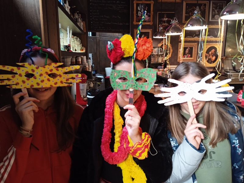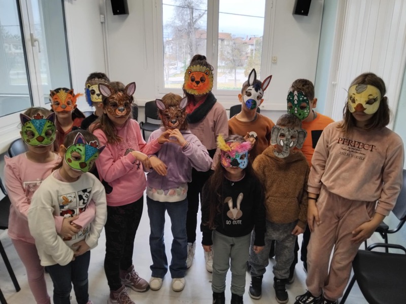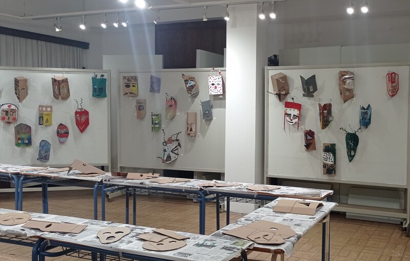 Την Κυριακή 23.02. και την Τετάρτη 26.02. παιδιά από το Τμήμα Ζωγραφικής τηςΚατερίνας Αναστασίου, κατασκεύασαν στο φουαγιέ, τρισδιάτατες αποκριάτικες μάσκες με κολάζ υλικών, με χαρτόνια, υφάσματα και χρώματα, εμπνευσμένες από δημιουργίες σύγχρονων εικαστικών καλλιτεχνών, αλλά και από ζωομορφικές μάσκες που χρησιμοποιούνται σε έθιμα της εποχής αυτής, στην Ελλάδα. Στα εργαστήρια της Κ. Αναστασίου συμμετείχαν περίπου 60 παιδιά.