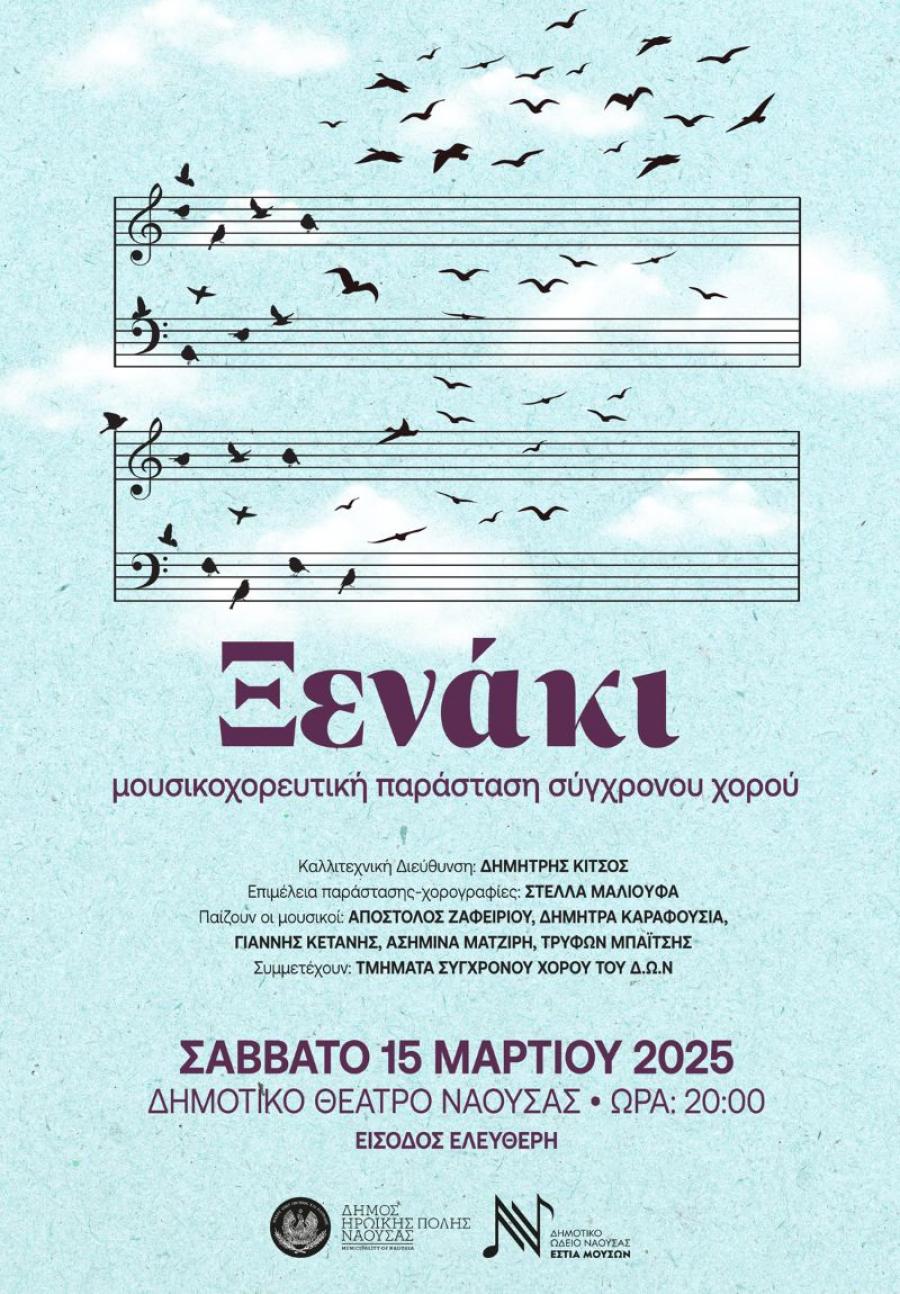 Το Δημοτικό Ωδείο Νάουσας "Εστία Μουσών"σε συνεργασία με την Αντιδημαρχία Πολιτισμού και με καλλιτέχνες της πόλης, παρουσιάζει τη μουσικοχορευτική παράσταση σύγχρονου χορού με τίτλο "Ξενάκι",το Σάββατο15 Μαρτίου 2025 και ώρα8.00μ.μ., στο Δημοτικό Θέατρο Νάουσας.Μια παράσταση που έχει ως στόχο την ανάδειξη πτυχών και επιπτώσεων που φέρνει η ξενιτιά στους ανθρώπους, είτε σε συλλογικό είτε σε ατομικό επίπεδο.