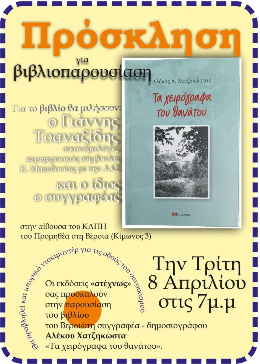 Τη τελευταία παρουσίαση του βιβλίου του με τίτλο «Τα χειρόγραφα του θανάτου» στη Βέροια, θα πραγματοποιήσει ο Βεροιώτης συγγραφέας-δημοσιογράφος Αλέκος Χατζηκώστας.