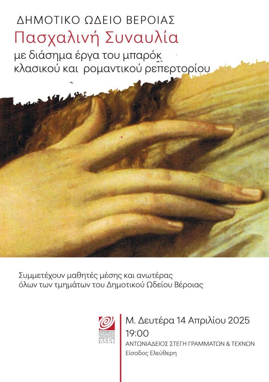Μαθητές μέσης και ανωτέρας, όλων των τμημάτων του Δημοτικού Ωδείου της ΚΕΠΑ Δ. Βέροιας, συμμετέχουν στην Πασχαλινή συναυλία που θα δοθεί την Μεγάλη Δευτέρα 14 Απριλίου 2025, στην Αντωνιάδειο Στέγη Γραμμάτων και Τεχνών Βέροιας, στις 7:00 το απόγευμα.