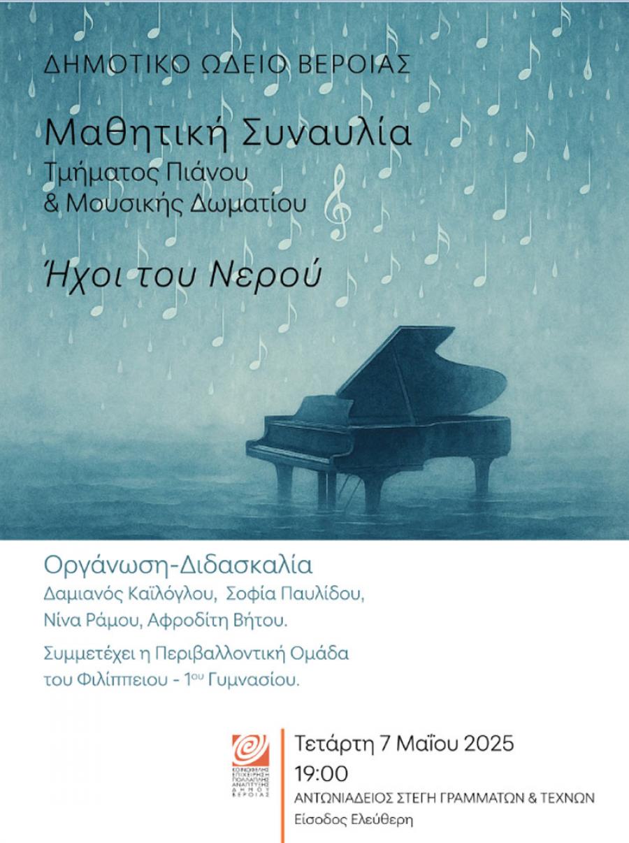 Το Δημοτικό Ωδείο της ΚΕΠΑ Δήμου Βέροιας, παρουσιάζει την μαθητική συναυλία "Οι Ήχοι του Νερού", που πραγματοποιείται από το τμήμα πιάνου των τάξεων της Σοφίας Παυλίδου, της Νίνας Ράμου και της Αφροδίτης Βήτου καθώς και το τμήμα μουσικής δωματίου της τάξης του Δαμιανού Καϊλόγλου.