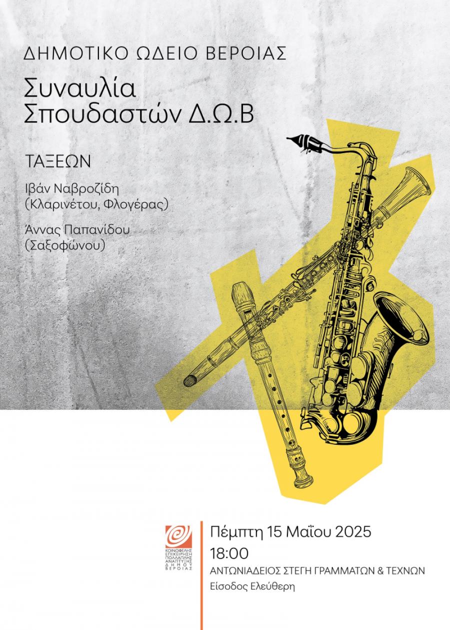 Με την ολοκλήρωση της φετινής εκπαιδευτικής χρονιάς στο δημοτικό Ωδείο της ΚΕΠΑ Δ. Βέροιας, οι μαθητές των τάξεων του Ιβάν Ναβροζίδη και της Άννας Παπανίδου, θα παρουσιάσουν κλασσικά έργα, για κλαρινέτο, φλογέρα και σαξόφωνο.