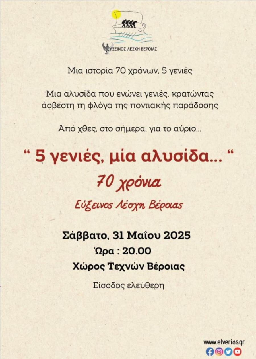 Βρισκόμαστε στην ευχάριστη θέση να προσκαλέσουμε όλους τους φίλους και τα μέλη στου συλλόγου στην παράσταση «5 γενιές, μια αλυσίδα» για τα 70 χρόνια συνεχούς λειτουργίας της «Ευξείνου Λέσχης Βέροιας».