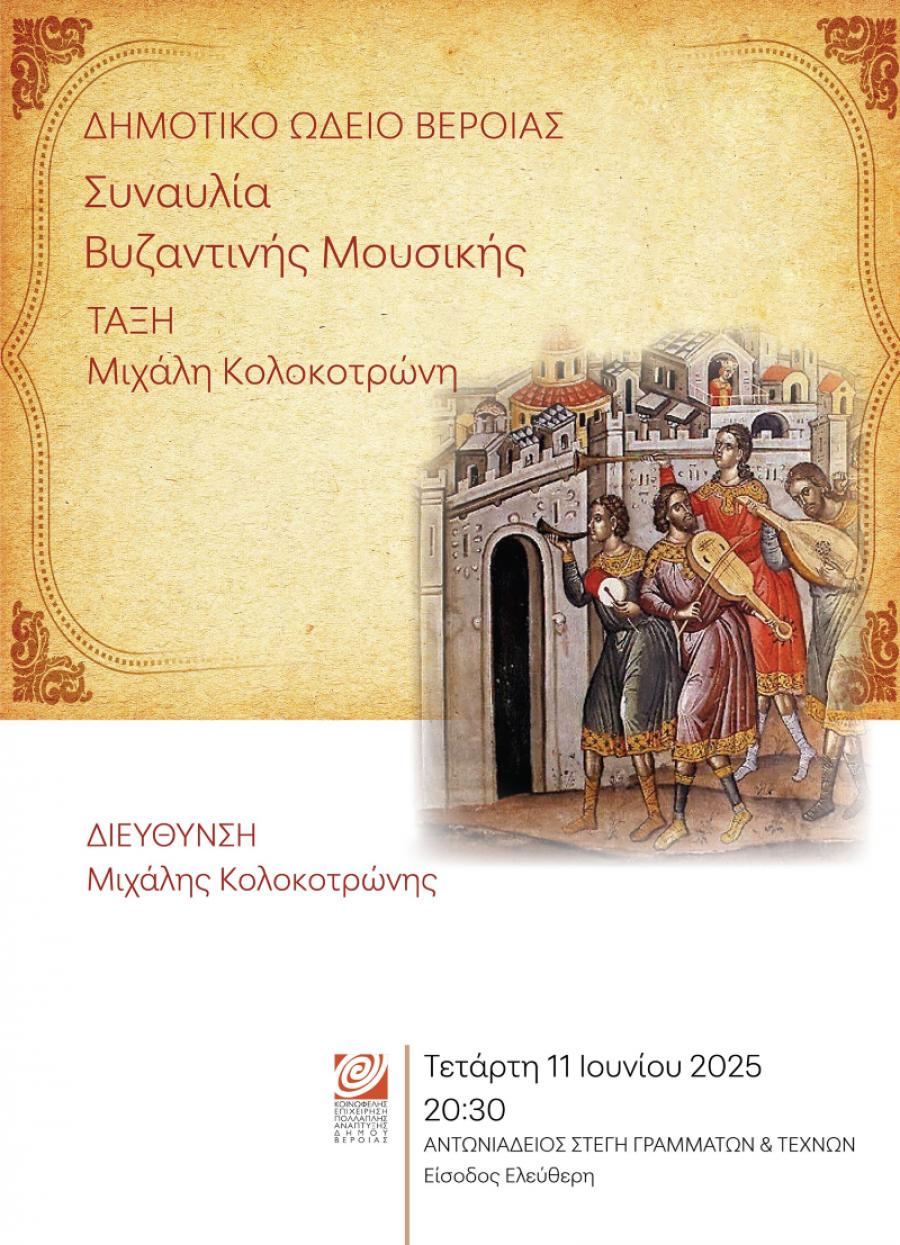 Mε αφορμή την λήξη της σχολικής χρονιάς, οι μαθητές του Τμήματος βυζαντινής μουσικής του δημοτικού Ωδείου της ΚΕΠΑ Δ. Βέροιας, δίνουν συναυλία υπο την διεύθυνση του δασκάλου του Τμήματος, Μιχάλη Κολοκοτρώνη, στην Αντωνιάδειο Στέγη Γραμμάτων και Τεχνών.