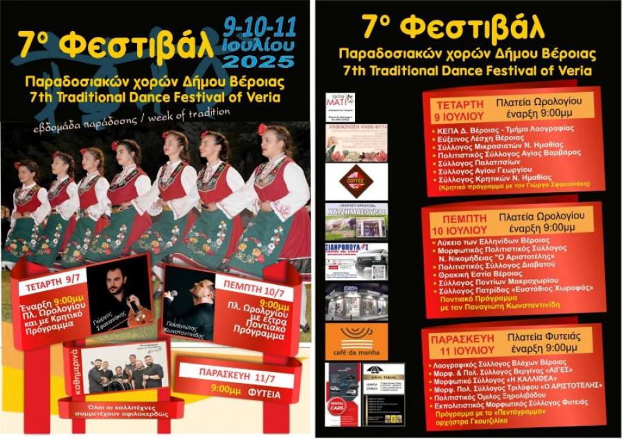 Με συμμετοχές από Πολιτιστικούς Συλλόγους της Βέροιας και των Δημοτικών Διαμερισμάτων, ξεκινά στις 9 Ιουλίου 2025 το 7ο Φεστιβάλ Παραδοσιακών Χορών του Δήμου Βέροιας, το οποίο θα πραγματοποιηθεί για τρεις ημέρες, στις 9, 10 και 11 Ιουλίου 2025.