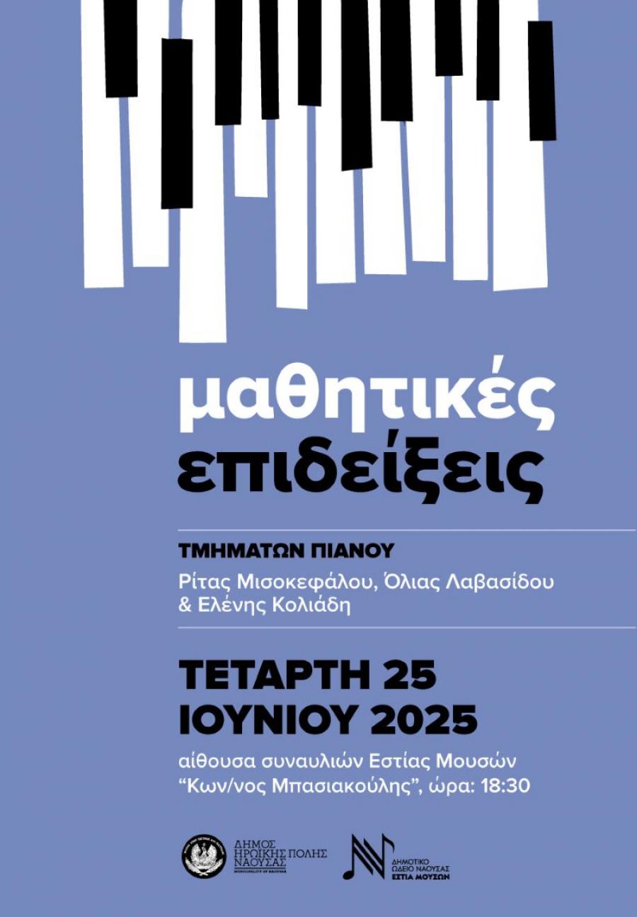 Την ετήσια μαθητική επίδειξη των τιμημάτων πιάνου των καθηγητριών Ρίτας Μισοκεφάλου, Όλιας Λαβασίδου, & Ελένης Κολιάδη παρουσιάζει το Δημοτικό Ωδείο Νάουσας "Εστία Μουσών", την Τετάρτη 25 Ιουνίου 2025 και ώρα 18.30 μ.μ. στην αίθουσα εκδηλώσεων "Κων/νος Μπασιακούλης" της Εστίας Μουσών.