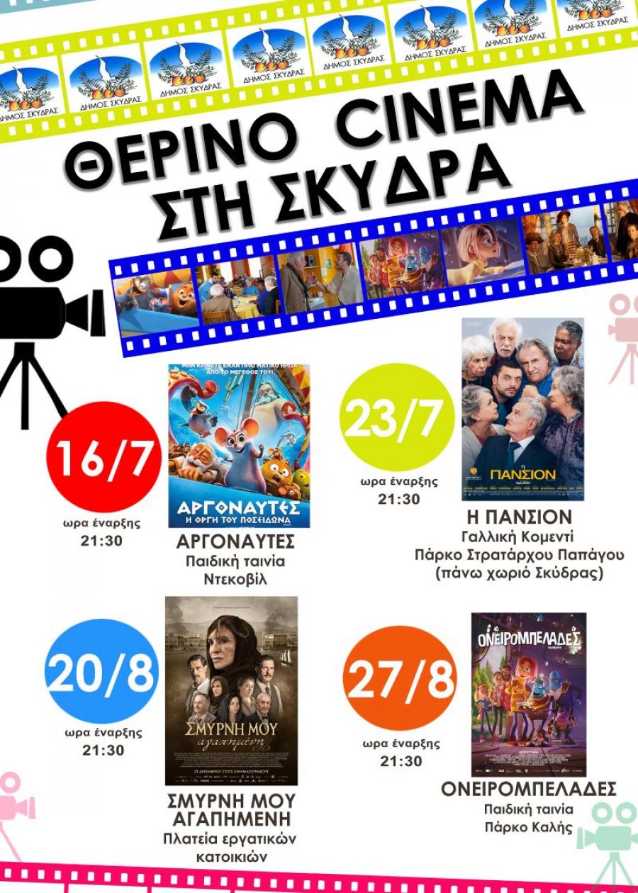 Η γοητεία της παρακολούθησης των καλοκαιρινών ταινιών είναι μια πρόκληση και μια εμπειρία που μας προσφέρει και φέτος ο Θερινός Κινηματογράφος Σκύδρας με τις παρακάτω ταινίες που προβάλλονται δωρεάν, σύμφωνα με το εξής πρόγραμμα: