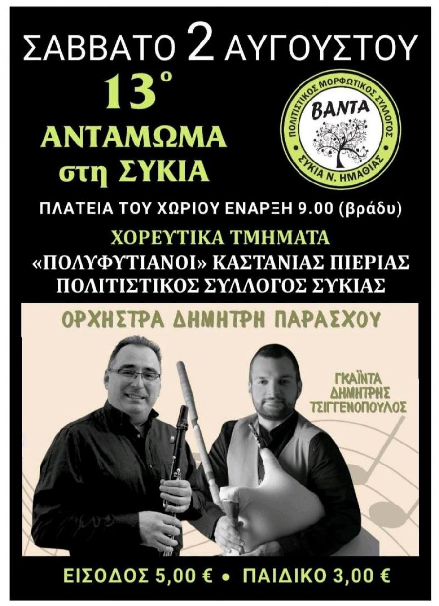 Με τη λάμψη της παράδοσης και τη ζωντάνια της τοπικής κουλτούρας, η Συκιά ετοιμάζεται να υποδεχτεί το 13ο Αντάμωμα, το βράδυ του Σαββάτου 2 Αυγούστου, στην κεντρική πλατεία του χωριού. Την εκδήλωση διοργανώνει ο Πολιτιστικός Μορφωτικός Σύλλογος «Βάντα», που εδώ και χρόνια κρατά άσβεστη τη φλόγα της πολιτιστικής κληρονομιάς της περιοχής.