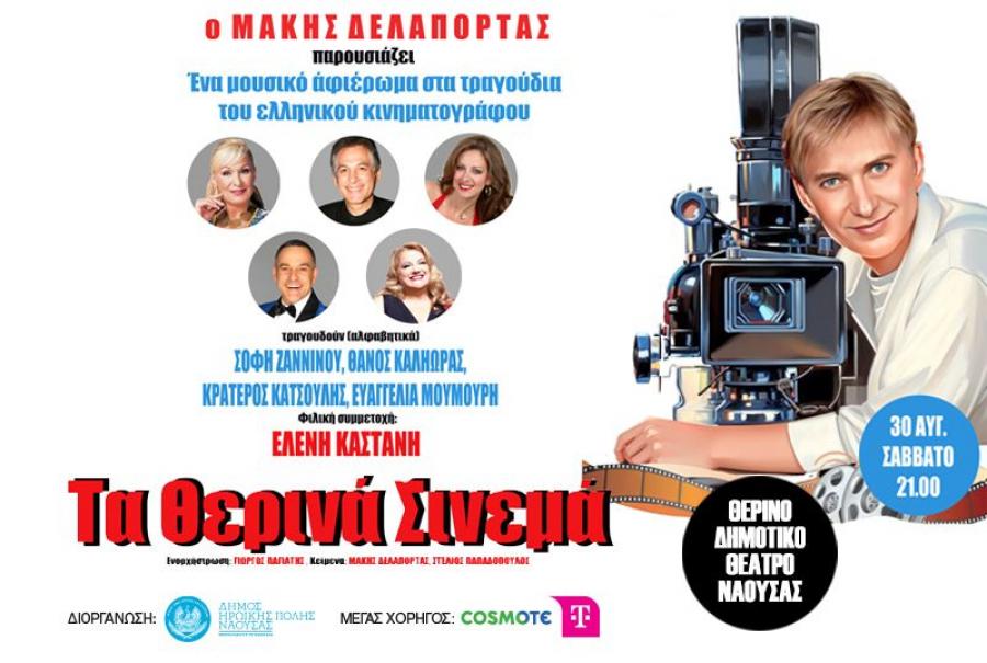 Μία μουσική παράσταση του Μάκη Δελαπόρτα αφιερωμένη στη μουσική και τα τραγούδια των πιο σημαντικών ταινιών που άφησαν εποχή στην ιστορία του Ελληνικού κινηματογράφου, το Σάββατο 30 Αυγούστου στις 21.00 στο Θερινό Δημοτικό Θέατρο Νάουσας «Μελίνα Μερκούρη».