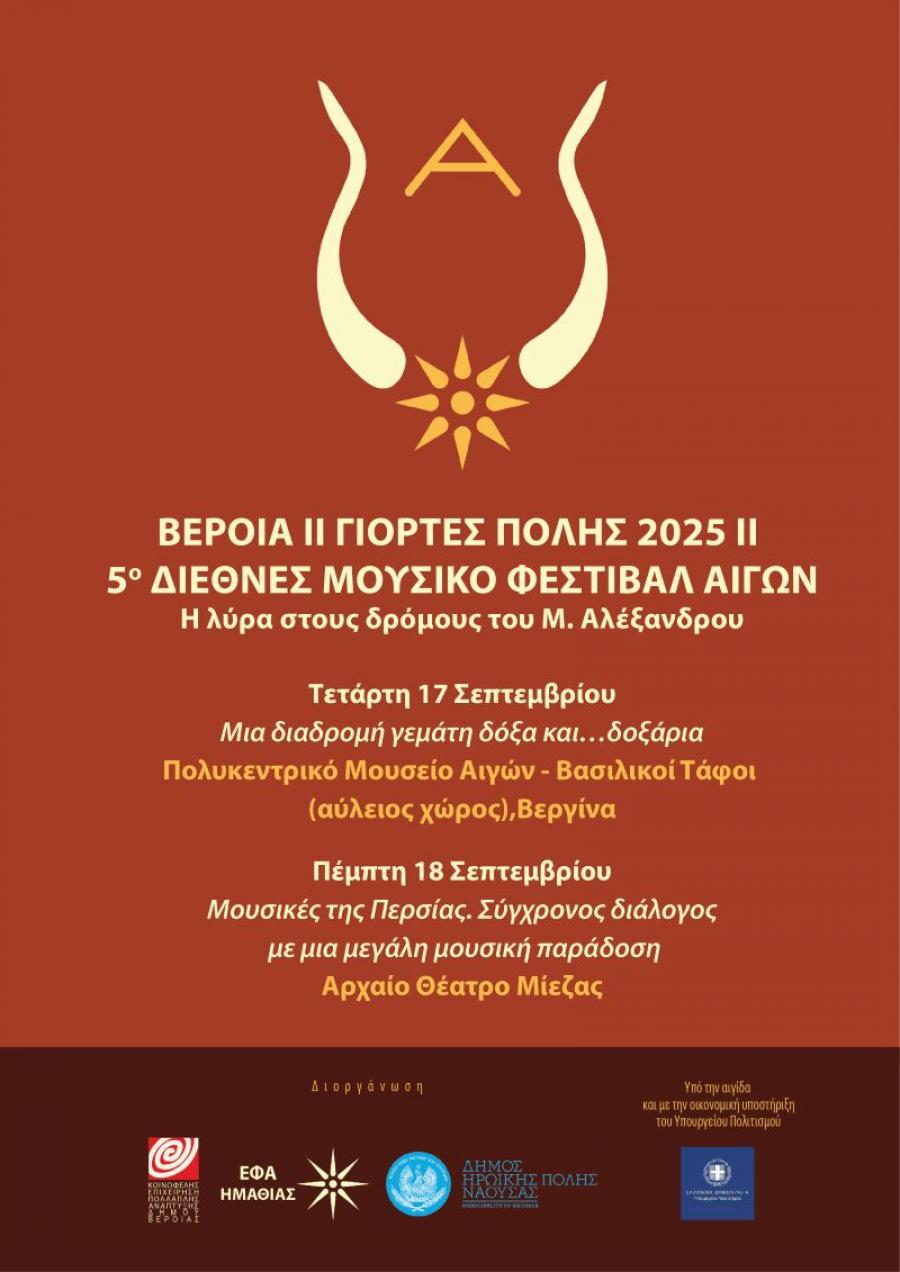 Με βασικό άξονα τις λύρες και τα τοξωτά όργανα που συνδέουν τους τόπους που επισκέφθηκε στο διάβα του ο Μέγας Αλέξανδρος, διοργανώνεται από την ΚΕΠΑ Δήμου Βέροιας με συνδιοργανωτές την Εφορεία Αρχαιοτήτων Ημαθίας και τον Δήμο Νάουσας,το 5ο Διεθνές Μουσικό Φεστιβάλ Αιγών, στις 17 και 18 Σεπτεμβρίου 2025, υπό την καλλιτεχνική διεύθυνση του Χρήστου Καλιοντζίδη.