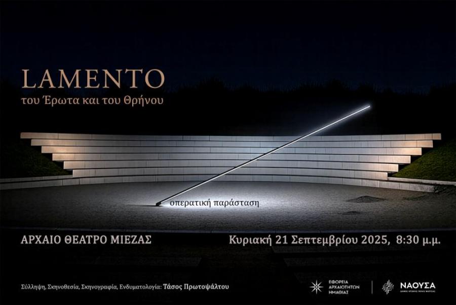 Η Εφορεία Αρχαιοτήτων Ημαθίας και ο Δήμος Νάουσας συνδιοργανώνουν και σας προσκαλούν στην οπερατική παράσταση Lamento – Του Έρωτα και του Θρήνου, που θα παρουσιαστεί στο Αρχαίο Θέατρο της Μίεζας την Κυριακή 21 Σεπτεμβρίου 2025, στις 8:30 μ.μ., σε μία και μοναδική βραδιά.
