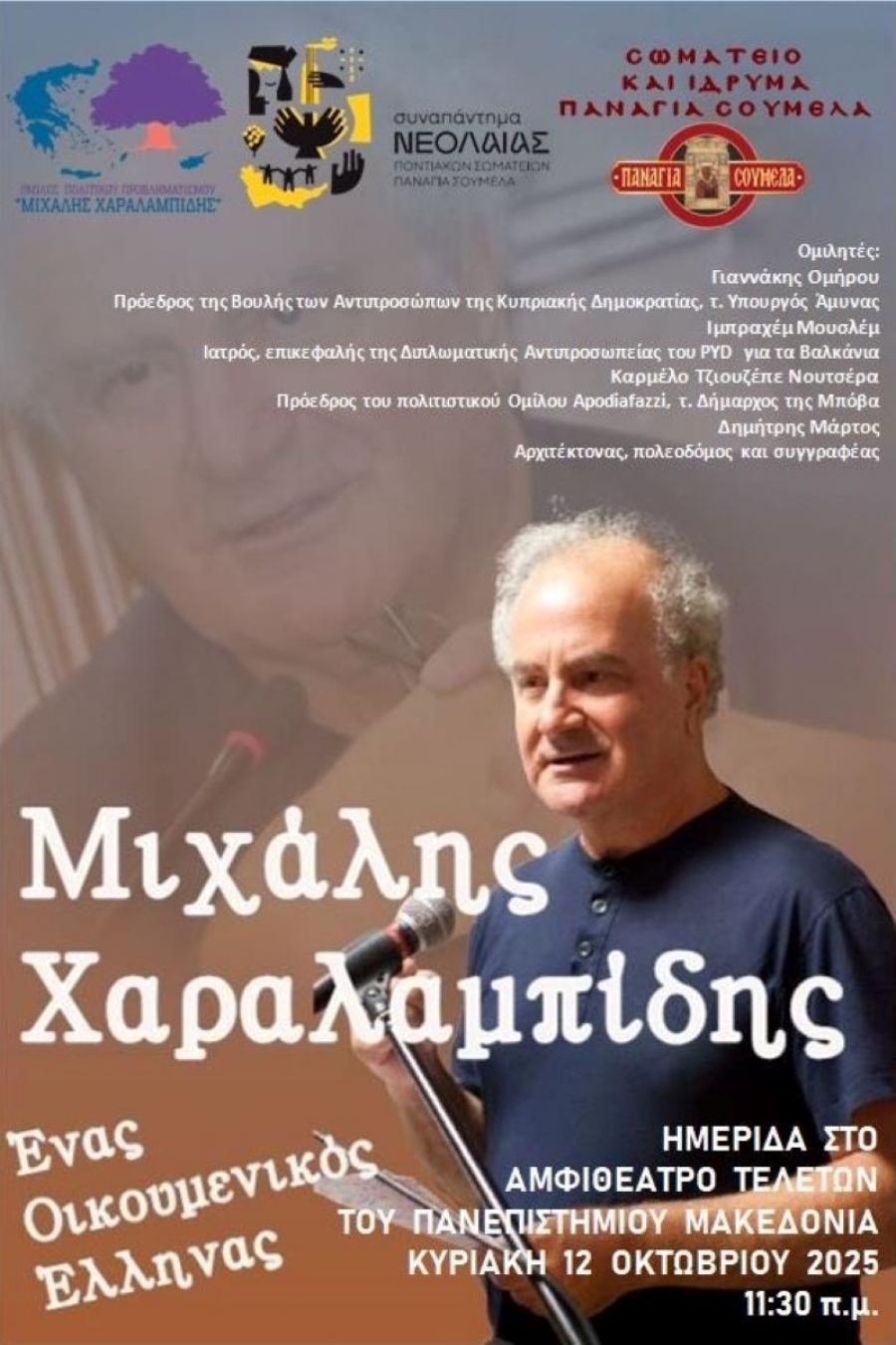 Αντικείμενο της ημερίδας είναι το έργο του πολιτικού και συγγραφέα Μιχάλη Χαραλαμπίδη, ενός οικουμενικού Έλληνα ποντιακής καταγωγής, που με το πνευματικό και πολιτικό του αποτύπωμα άφησε ισχυρό στίγμα στην ελληνική και διεθνή σκέψη.