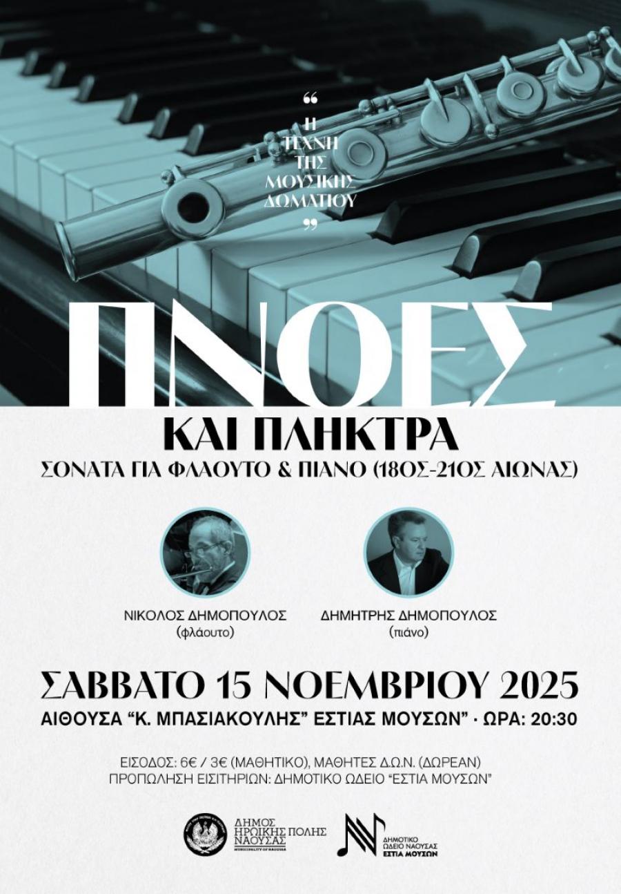 Ο Δήμος Ηρωικής Πόλης Νάουσας, στο πλαίσιο της προσπάθειας προώθησης του πολιτισμού, των τεχνών και της καλλιτεχνικής δημιουργίας, παρουσιάζει την συναυλία μουσικής δωματίου “Πνοές και Πλήκτρα - Η φόρμα Σονάτα για Φλάουτο και Πιάνο από το 18ο έως τον 21ο αιώνα”, το Σάββατο 15 Νοεμβρίου 2025 και ώρα 20:30, στην αίθουσα συναυλιών “Κ.Μπασιακούλης” του Δημοτικού Ωδείου Νάουσας.