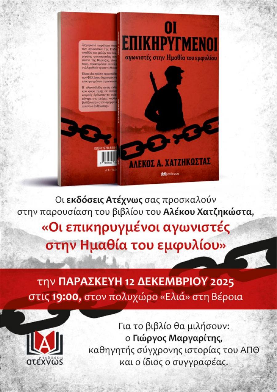 Οι εκδόσεις "Ατεχνως" σας προσκαλούν στην παρουσίαση του νέου βιβλίου του Ημαθιώτη δημοσιογράφου-συγγραφέα Αλέκου Χατζηκώστα "Οι επικηρυγμένοι αγωνιστές στην Ημαθία του Εμφυλίου" που θα γίνει την Παρασκευή 12 Δεκέμβρη στις 7μ.μ στον πολυχώρο "ΕΛΙΑ" στη Βέροια.