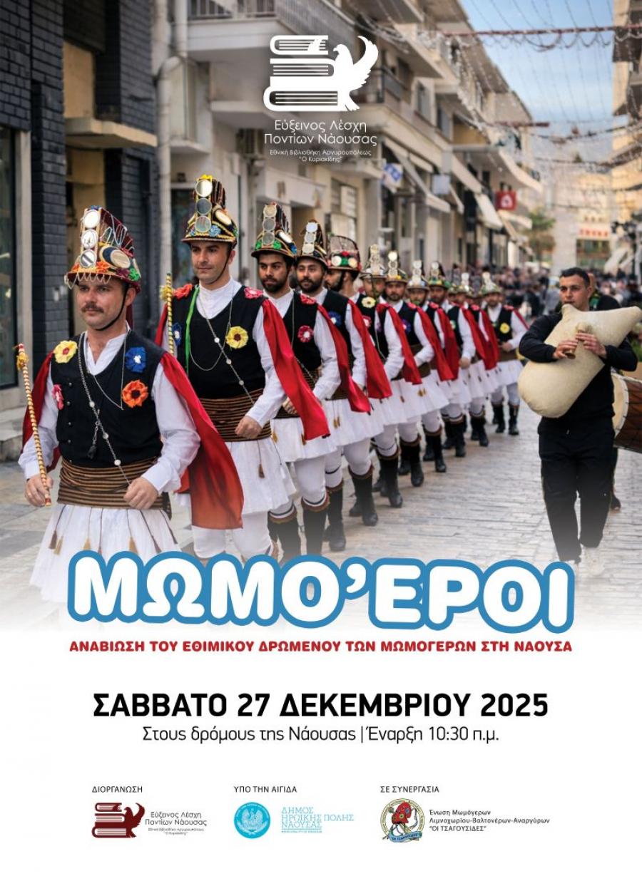 Η Νάουσα υποδέχεται και φέτος το πανάρχαιο ποντιακό έθιμο των Μωμόγερων, το Σάββατο 27 Δεκεμβρίου 2025, υπό την διοργάνωση της Ευξείνου Λέσχης Ποντίων Νάουσας. Από τις 10:30 π.μ., με αφετηρία το κτίριο του σωματείου, οι Μωμόγεροι, η Νύφη, ο Διάβολον, ο Γέρον, η Γραία και οι υπόλοιποι συμβολικοί χαρακτήρες θα διασχίσουν τους κεντρικούς δρόμους της πόλης, μεταφέροντας το τελετουργικό και εορταστικό δρώμενο στο αστικό τοπίο.