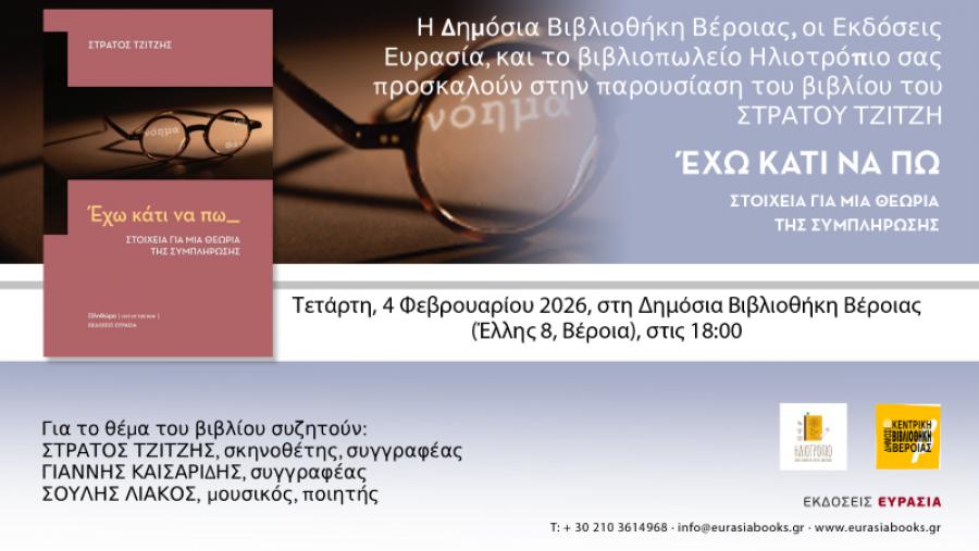 Η Δημόσια Κεντρική Βιβλιοθήκη της Βέροιας, οι εκδόσεις Ευρασία και το βιβλιοπωλείο Ηλιοτρόπιο σας προσκαλούν, την Τετάρτη 4 Φεβρουαρίου, στις 6 το απόγευμα, στην αίθουσα εκδηλώσεων της Βιβλιοθήκης, στην παρουσίαση του βιβλίου φιλοσοφικών σημειώσεων του Βεροιώτη σκηνοθέτη και συγγραφέα ΣΤΡΑΤΟΥ ΤΖΙΤΖΗ «Έχω κάτι να πω_Στοιχεία για μια θεωρία της Συμπλήρωσης» που κυκλοφορεί από τις εκδόσεις Ευρασία.