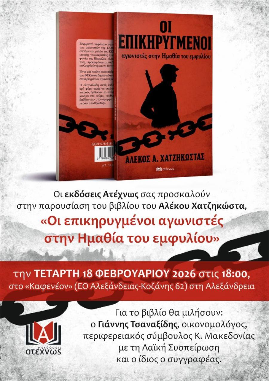 Το ταξίδι παρουσίασης του νέου βιβλίου του Ημαθιώτη δημοσιογράφου-συγγραφέα Αλέκου Χατζηκώστα «Οι επικηρυγμένοι αγωνιστές στην Ημαθία του εμφυλίου» (εκδόσεις ατεχνως) συνεχίζεται στην Αλεξάνδρεια.