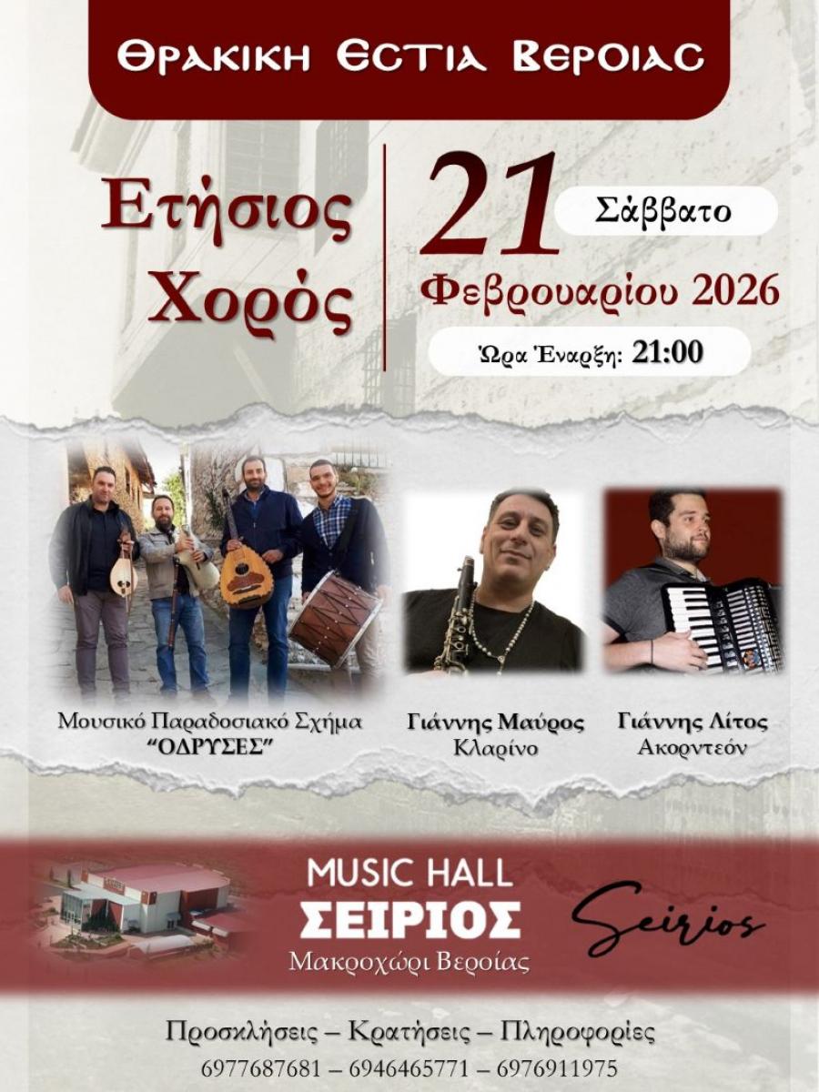 Σας προσκαλούμε στον ετήσιο χορό της Θρακικής Εστίας Βέροιας που θα πραγματοποιηθεί την 21ηΦεβρουαρίου 2026 ημέρα Σάββατο και ώρα έναρξης 21:00 στο Music Hall Σείριος στο Μακροχώρι. Το Διοικητικό Συμβούλιο