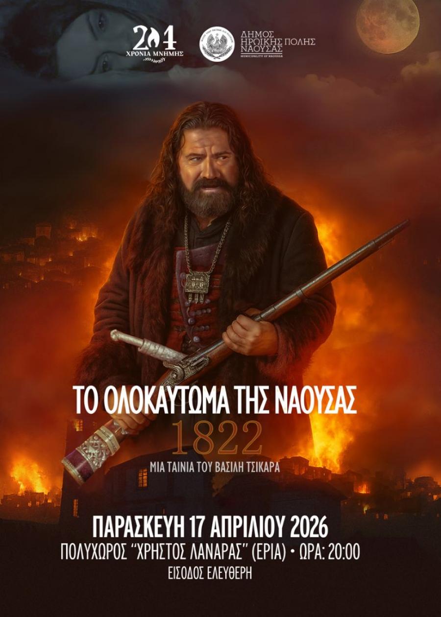 Στο πλαίσιο της 204ης Επετείου Ολοκαυτώματος της Νάουσας, την Παρασκευή 17 Απριλίου 2026 και ώρα 20:00 στον Πολυχώρο Πολιτισμού "Χρήστος Λαναράς" (ΕΡΙΑ), θα πραγματοποιηθούν οι προβολές της ταινίας του Βασίλη Τσικάρα «1822 - Το Ολοκαύτωμα της Νάουσας» και του ντοκιμαντέρ "Το Ολοκαύτωμα της Νάουσας", παραγωγής του Δήμου Νάουσας.