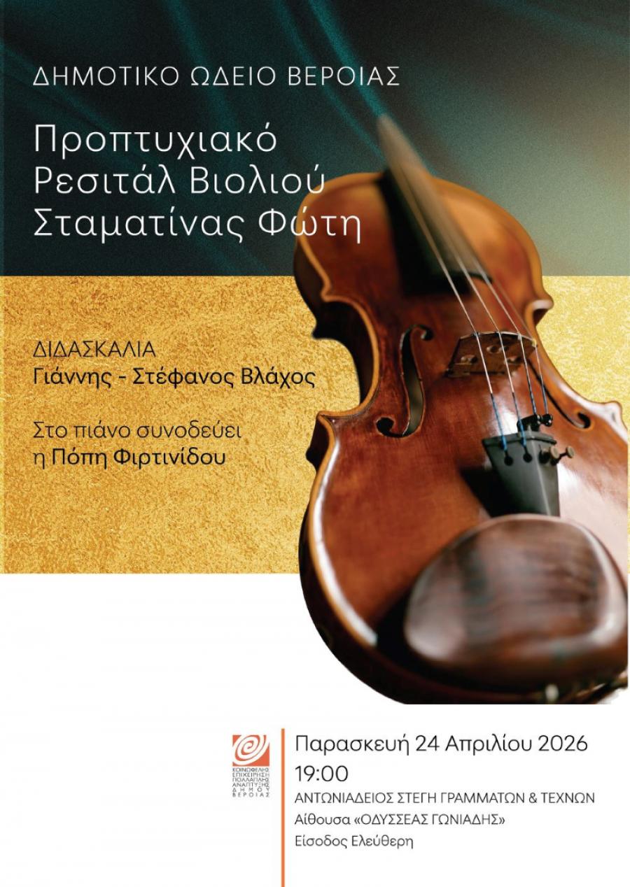 Προπτυχιακό ρεσιτάλ βιολιού παρουσιάζει η Σταματίνα Φώτη, μαθήτρια του Δημοτικού Ωδείου της ΚΕΠΑ Δήμου Βέροιας, με την διδασκαλία του καθηγητή του Τμήματος, Γιάννη Στέφανου Βλάχου, εν όψει των απολυτηρίων εξετάσεων. Στο πιάνο συνοδεύει η Πόπη Φιρτινίδου.