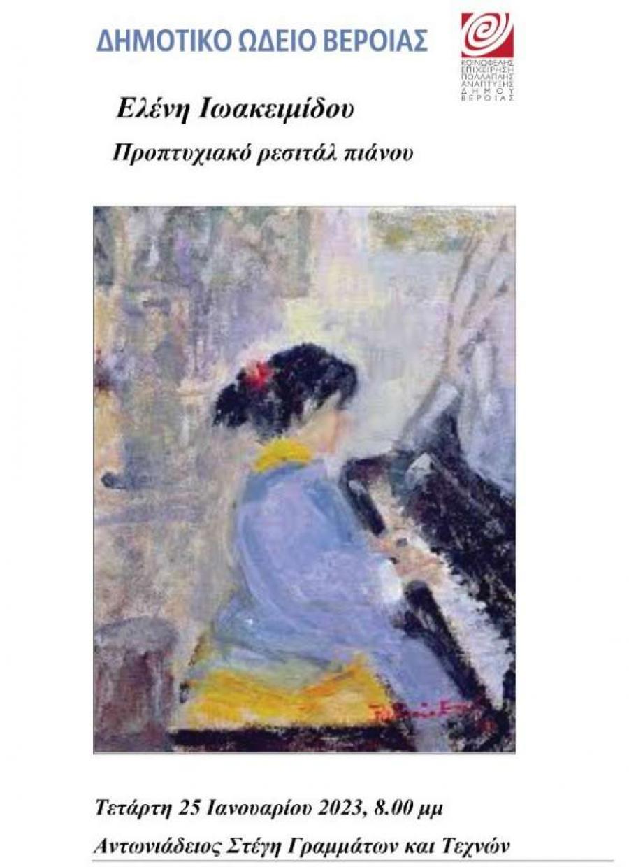 Η Ελένη Ιωακειμίδου, μαθήτρια πιάνου του Δημοτικού Ωδείου Βέροιας, στην τάξη της κ. Πόπης Φιρτινίδου, θα παρουσιάσει το προπτυχιακό της ρεσιτάλ.