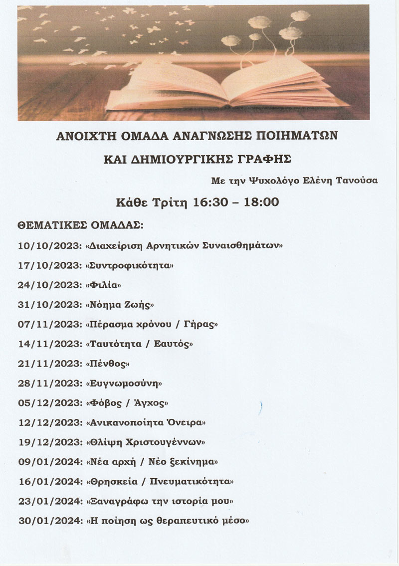 - Κάθε Τρίτη ανακαλύπτουμε πτυχές του εαυτού μας και εκφράζουμε τα συναισθήματα και τις σκέψεις μας μέσα από την ανάγνωση ποιημάτων και τη δημιουργική γραφή!