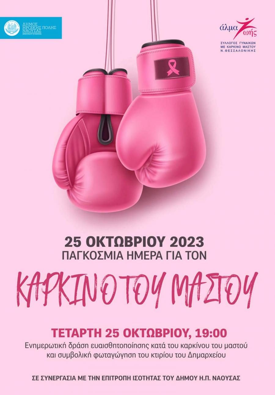 Συμβολική φωταγώγηση του κτιρίου του δημαρχείου και ενημερωτική δράση με αφορμή τον Μήνα Ευαισθητοποίησης για την Πρόληψη του Καρκίνου του Μαστού που είναι ο Οκτώβριος, διοργανώνει ο Δήμος Νάουσας και η Επιτροπή Ισότητας, την Τετάρτη 25 Οκτωβρίου 2023, ώρα 19:00, στέλνοντας μήνυμα ευαισθητοποίησης και ενότητας για τον καθημερινό αγώνα που δίνεται παγκοσμίως κατά της ασθένειας.